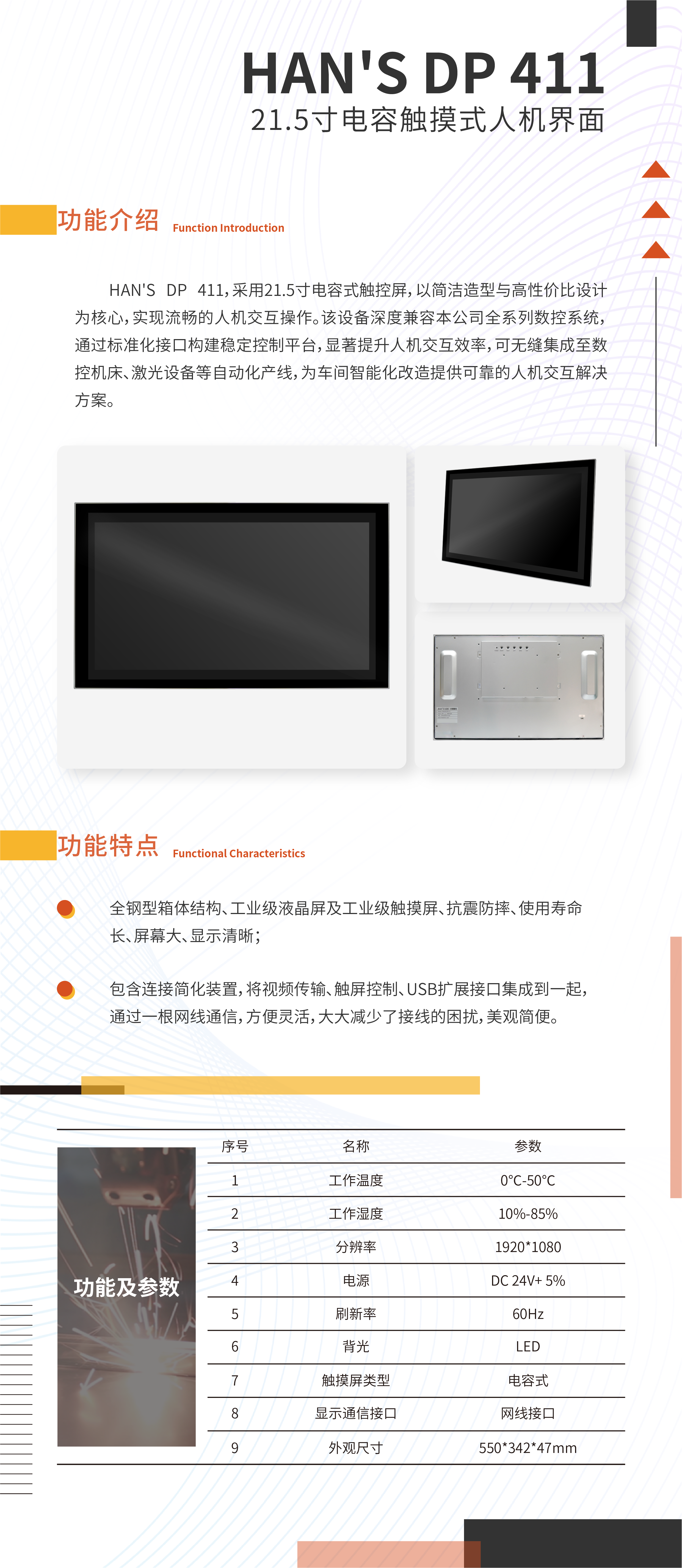 HAN'S DP 411,采用21.5寸電容式觸控屏,以簡潔造型與高性價比設(shè)計為核心,實現(xiàn)流暢的人機交互操作。該設(shè)備深度兼容本公司全系列數(shù)控系統(tǒng),通過標(biāo)準(zhǔn)化接口構(gòu)建穩(wěn)定控制平臺,顯著提升人機交互效率,可無縫集成至數(shù)控機床、激光設(shè)備等自動化產(chǎn)線,為車間智能化改造提供可靠的人機交互解決方案。