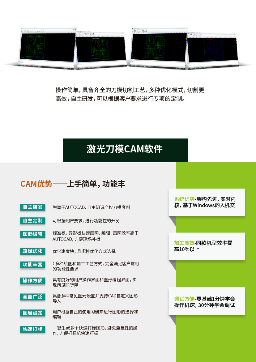 Han’s LawoCam激光刀模專業(yè)CAM軟件,操作簡單,具備齊全的刀模切割工藝,多種優(yōu)化模式,切割更高效,自主研發(fā),可以根據(jù)客戶要求進(jìn)行專項(xiàng)的定制。