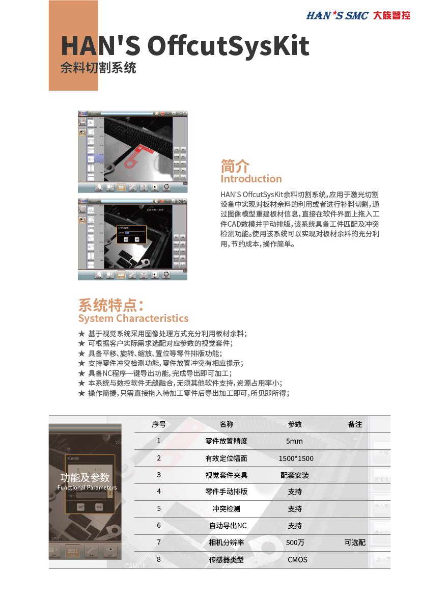HAN'S OffcutSysKit切割余料系統(tǒng),應(yīng)用于激光切割設(shè)備中實現(xiàn)對板材余料的二次利用,采用機器視覺的方式充分發(fā)揮板材廢料價值,通過圖像模型重建板材信息、利用軟件手動排版,并具備工件匹配及沖突檢測功能。本系統(tǒng)可以最大限度的發(fā)揮板材的廢料,節(jié)約成本,提高設(shè)備的加工效率,可用于激光切割的各類加工應(yīng)用中。